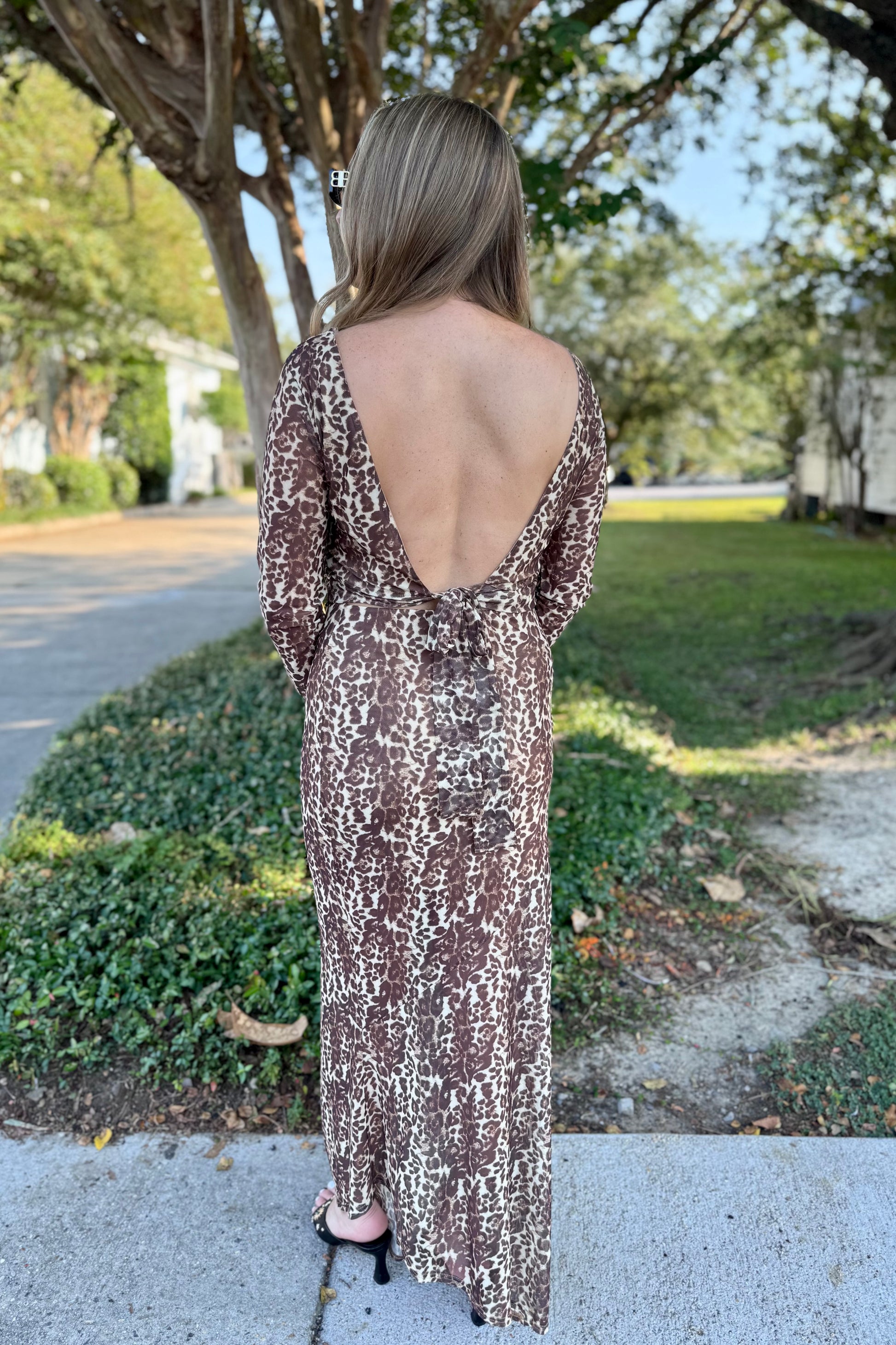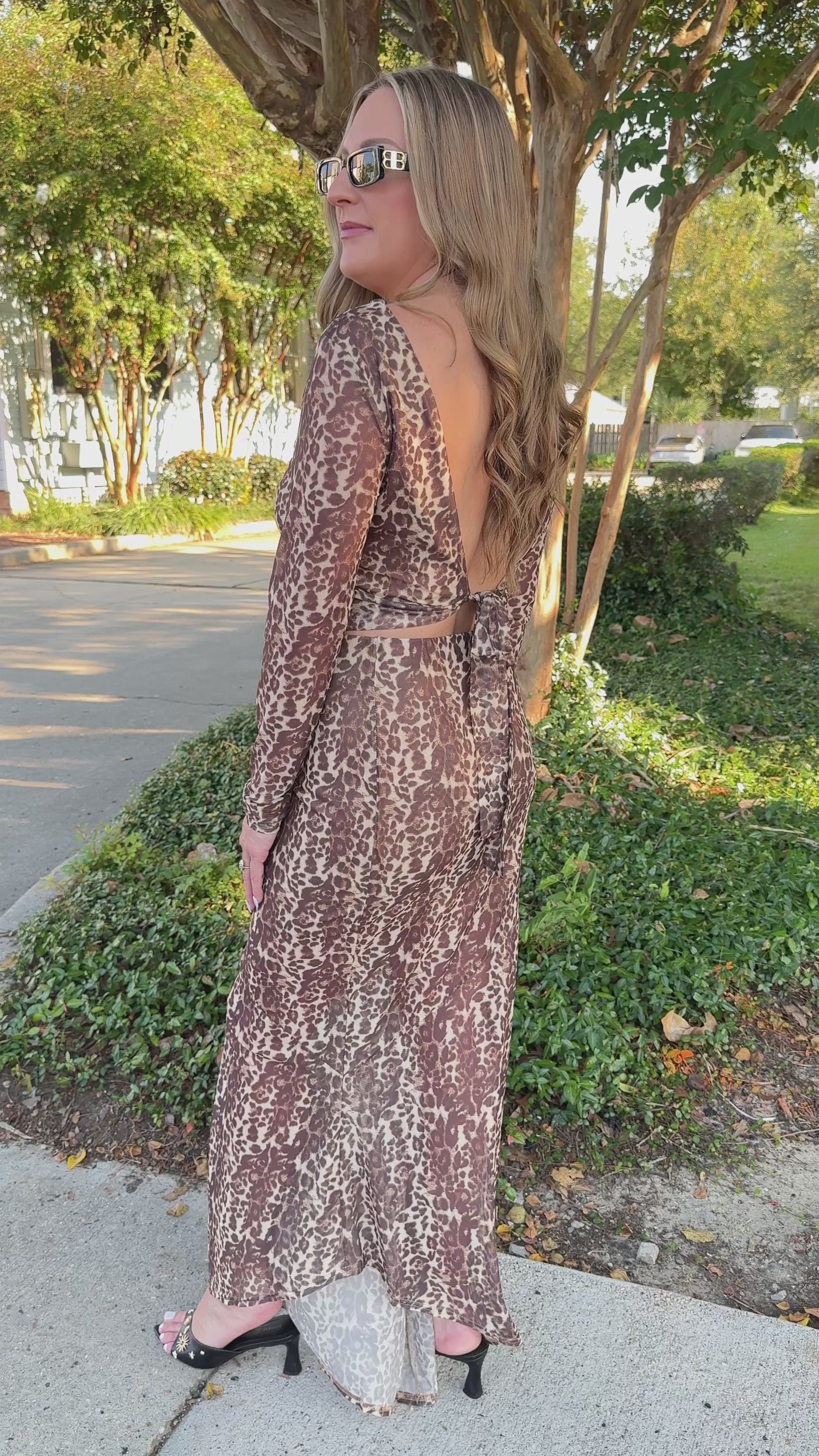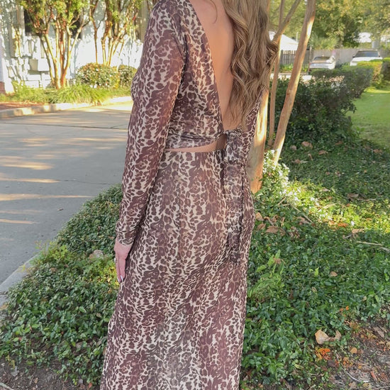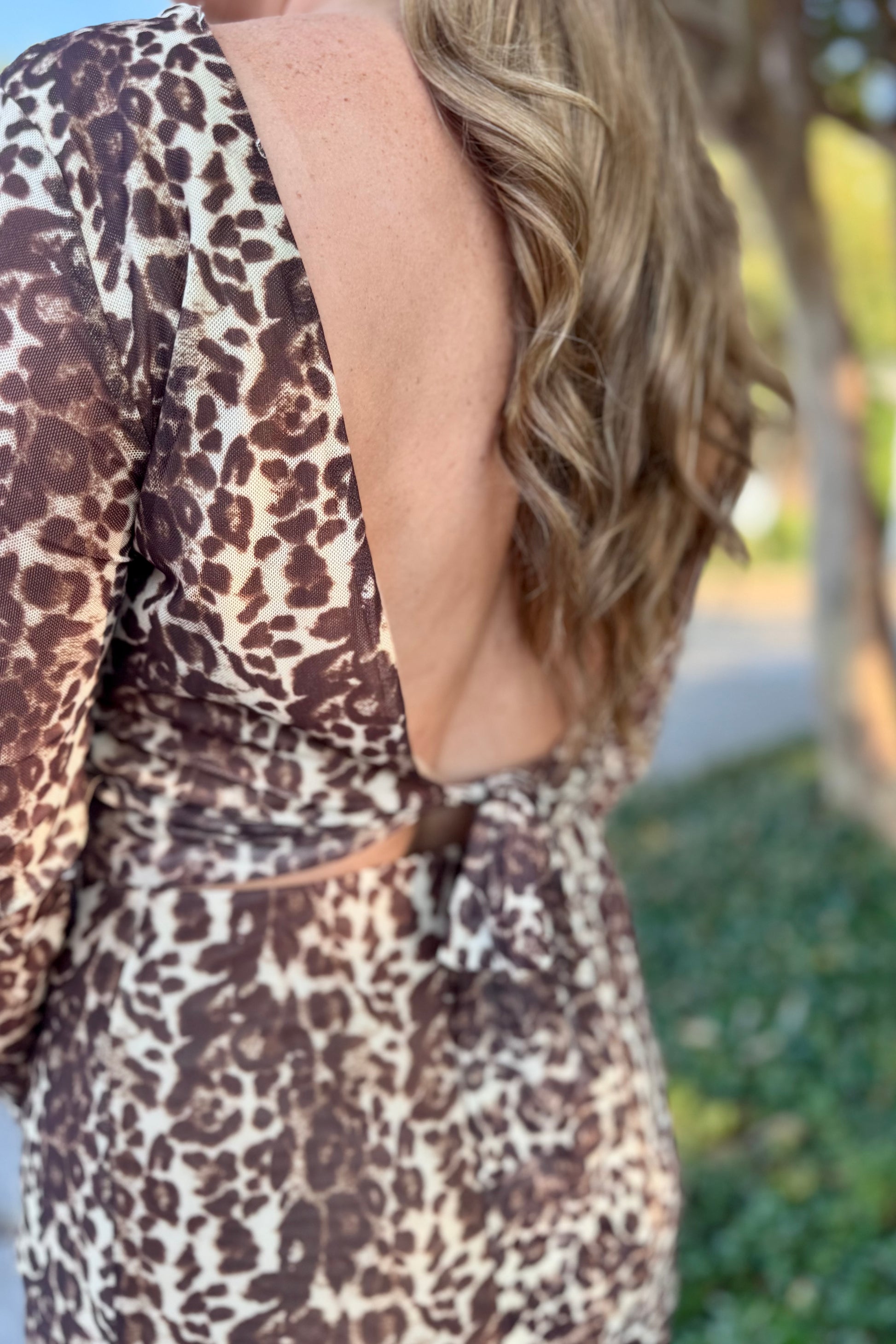 Turn heads in the Aurenne Set, featuring a bold leopard print two-piece that’s all about fun and flair. The open-back top adds a cheeky twist, while the flowing mesh skirt brings a light, breezy vibe to your look. Perfect for nights out or making a statement anywhere you go!