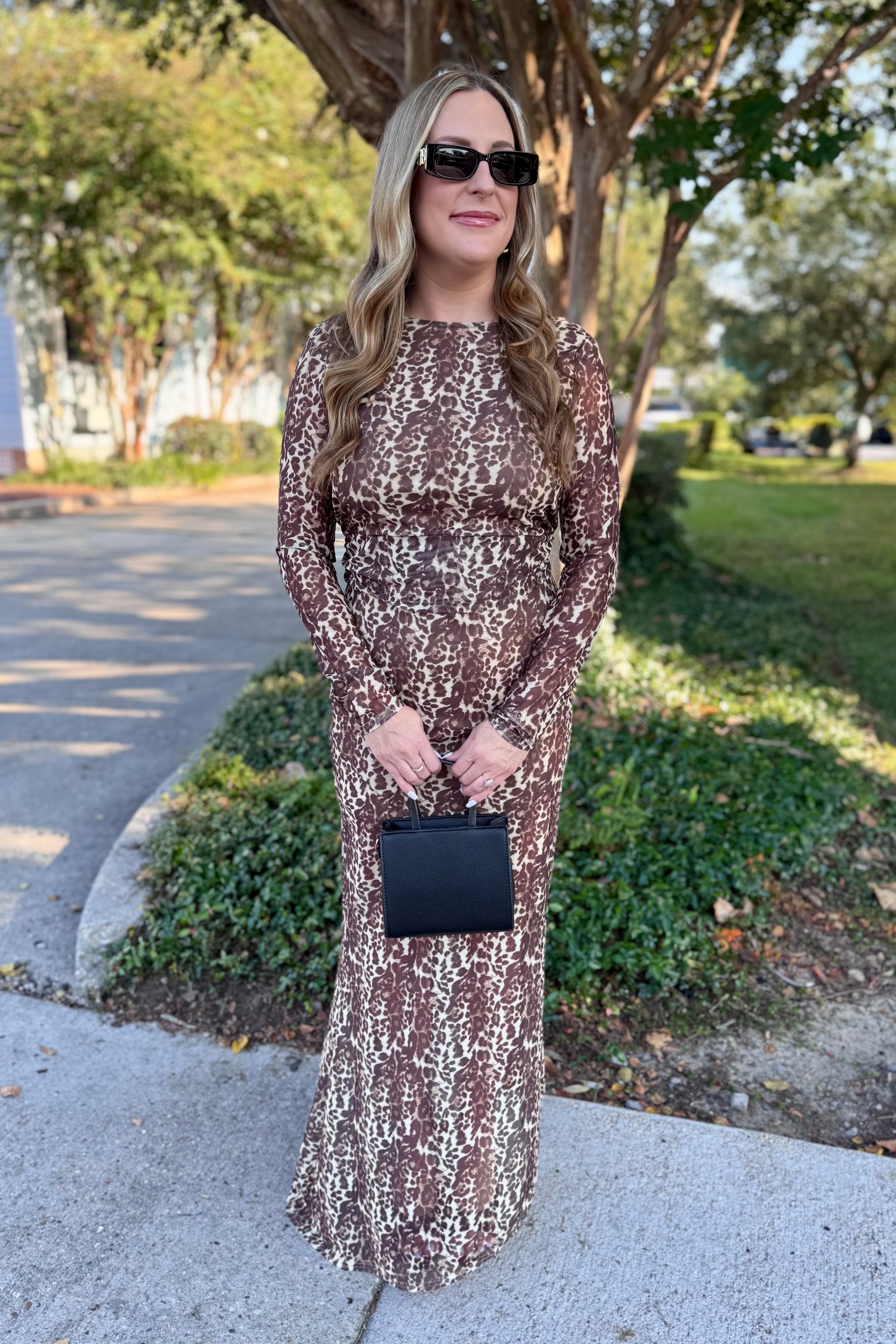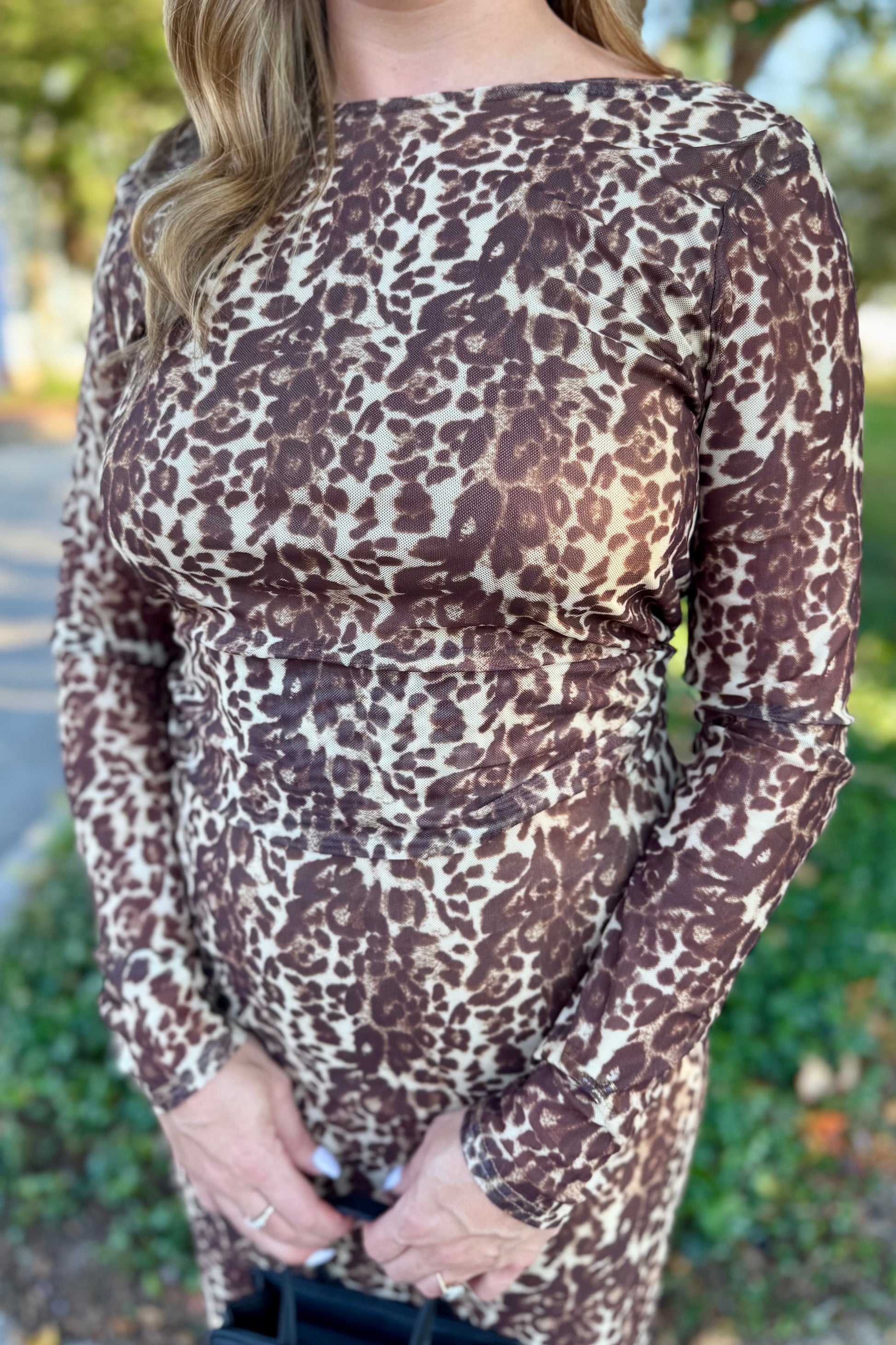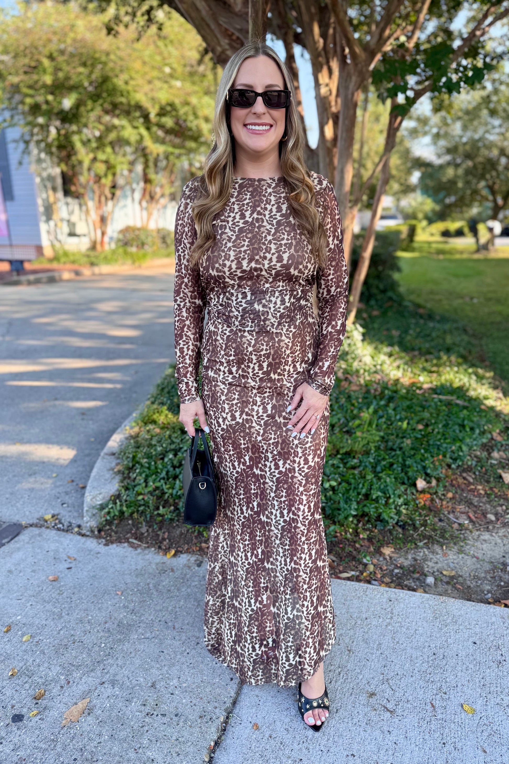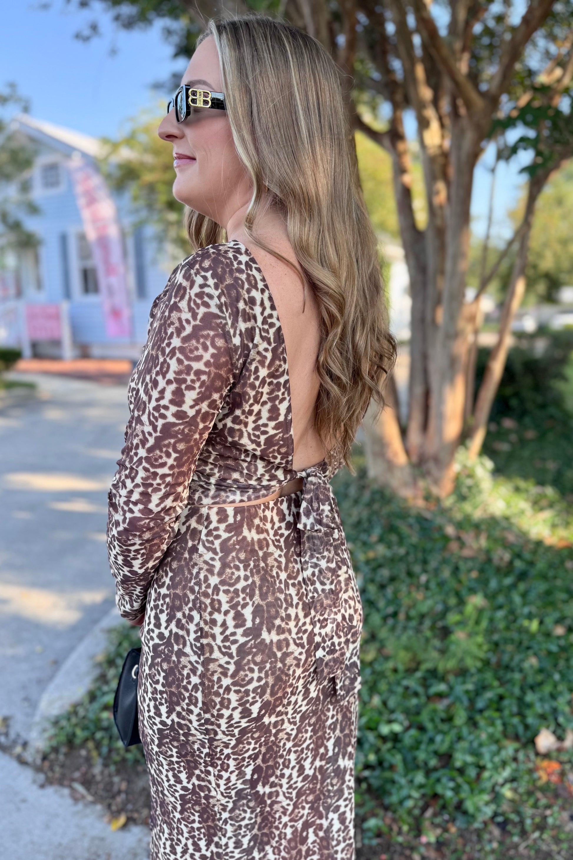 Turn heads in the Aurenne Set, featuring a bold leopard print two-piece that’s all about fun and flair. The open-back top adds a cheeky twist, while the flowing mesh skirt brings a light, breezy vibe to your look. Perfect for nights out or making a statement anywhere you go!