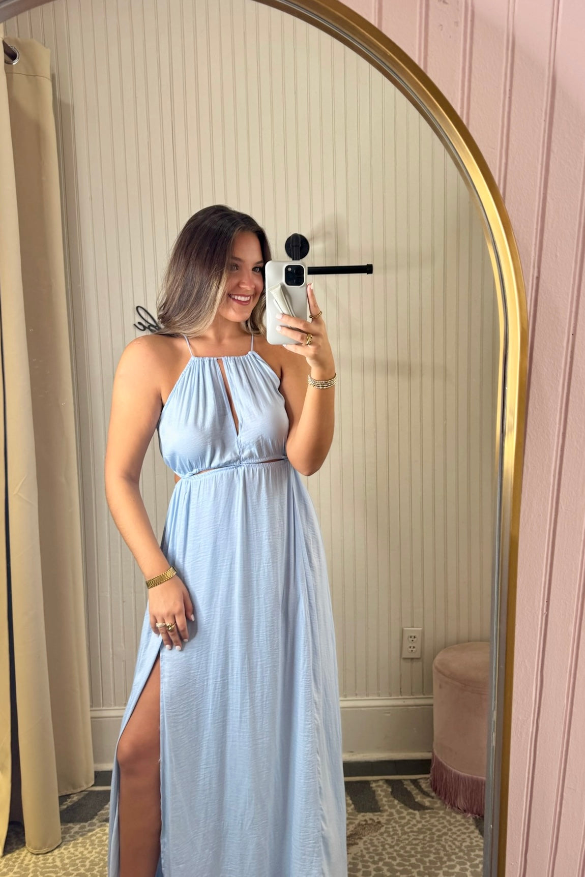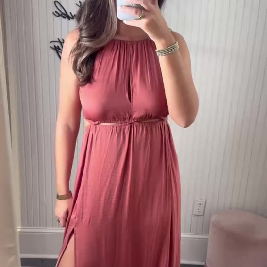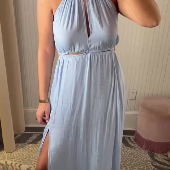 "Embrace your inner goddess with our Clay Dress, inspired by the flowy, Grecian style. Featuring a playful cut out and tie neck detail, this dress will make you feel like you're on a vacation. Perfect for a statement look, this dress is a must-have for any fashion-forward individual. (Get ready to turn heads!)"