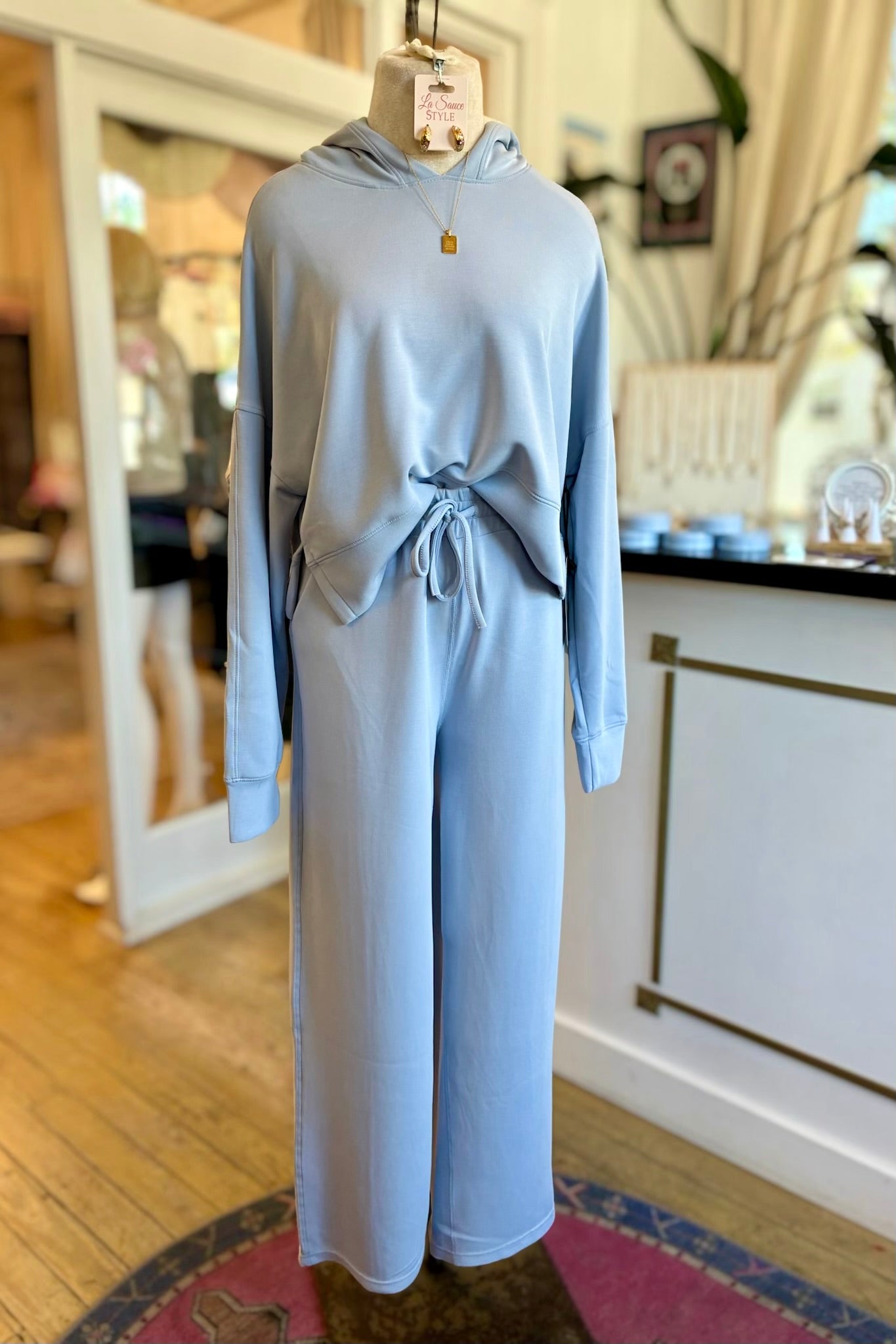 Get cozy and cute with the Kathy Hoodie. Made with a light blue core and super soft air scuba fabric, this crop hoodie is perfect for all-day comfort and style. Show off your quirkiness with this unique piece.