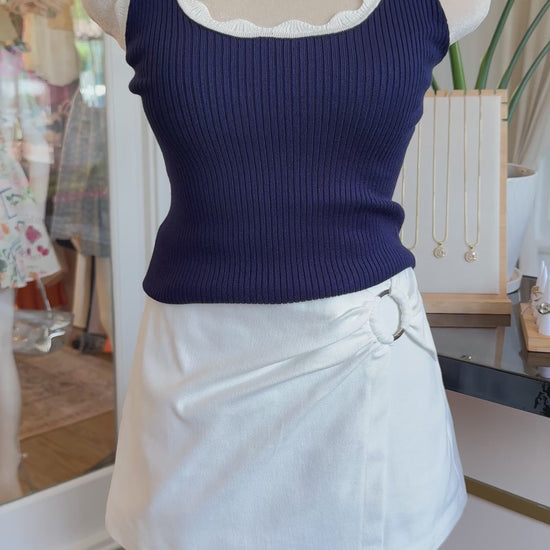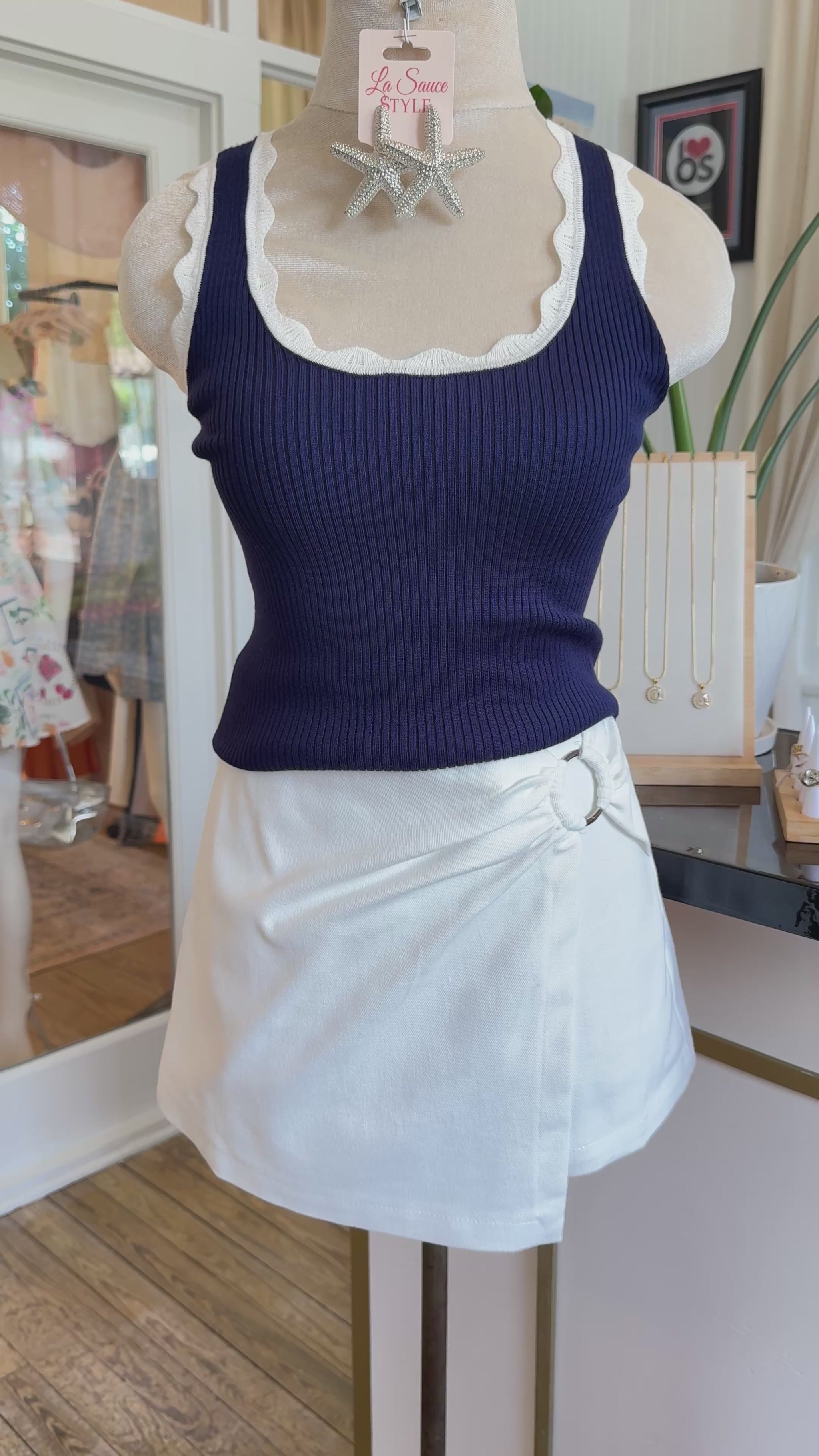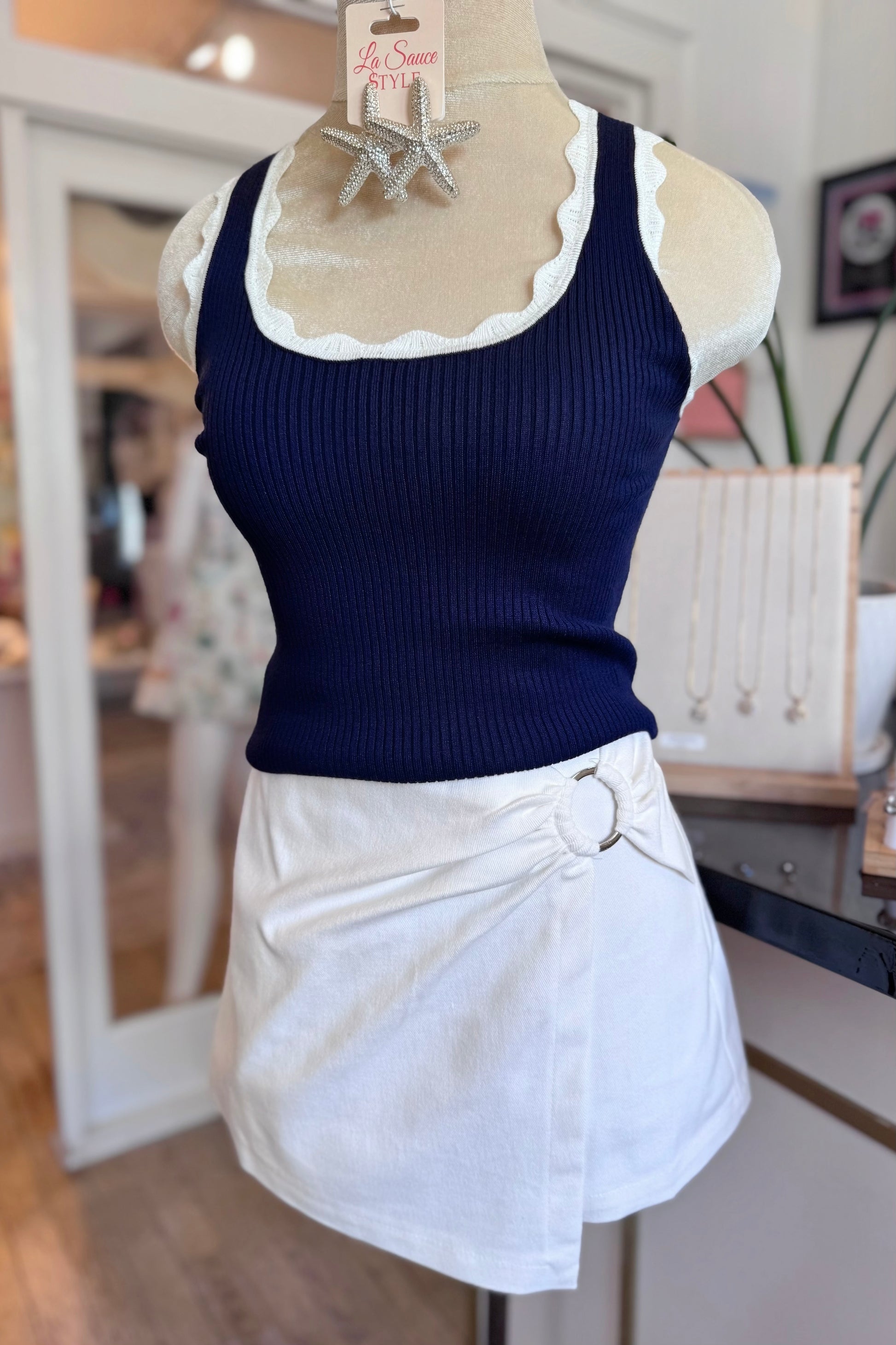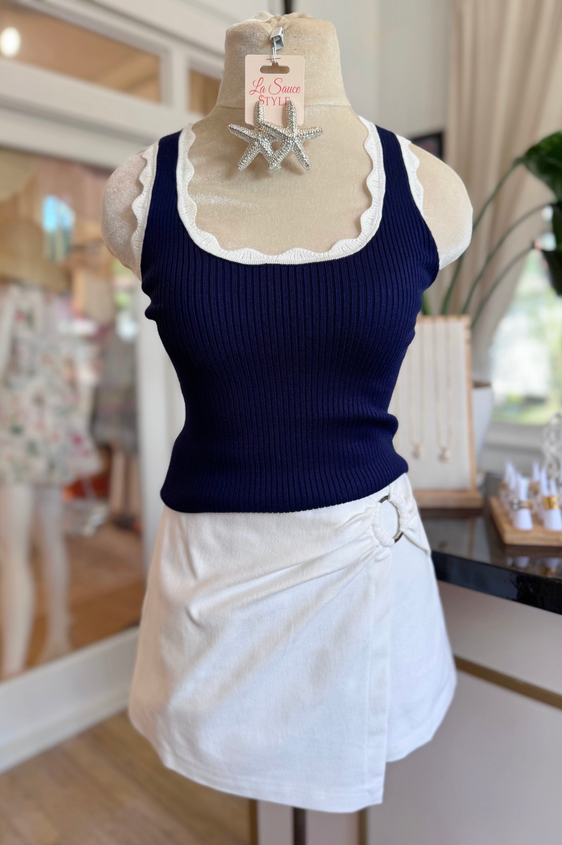 The Navi Tank brings a playful vibe to your outfit with its soft sweater knit fabric and eye-catching contrasting trim. Perfect for layering or wearing solo, this tank adds a fun pop of style while keeping you comfy all day long.