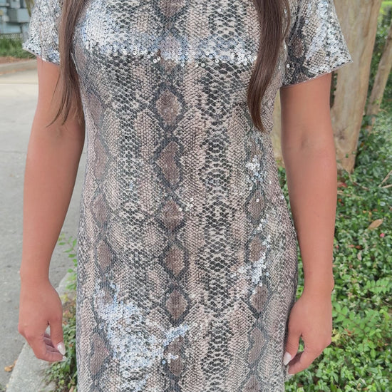 Turn heads with this clear sequin snake print mini dress that shimmers with every step. Its playful design combines bold snake motifs with sparkling sequins, making it the perfect choice for parties or nights out. The mini length showcases your legs, while the eye-catching details ensure you stand out in any crowd. Effortlessly mix fun and fierce with this unique statement piece.