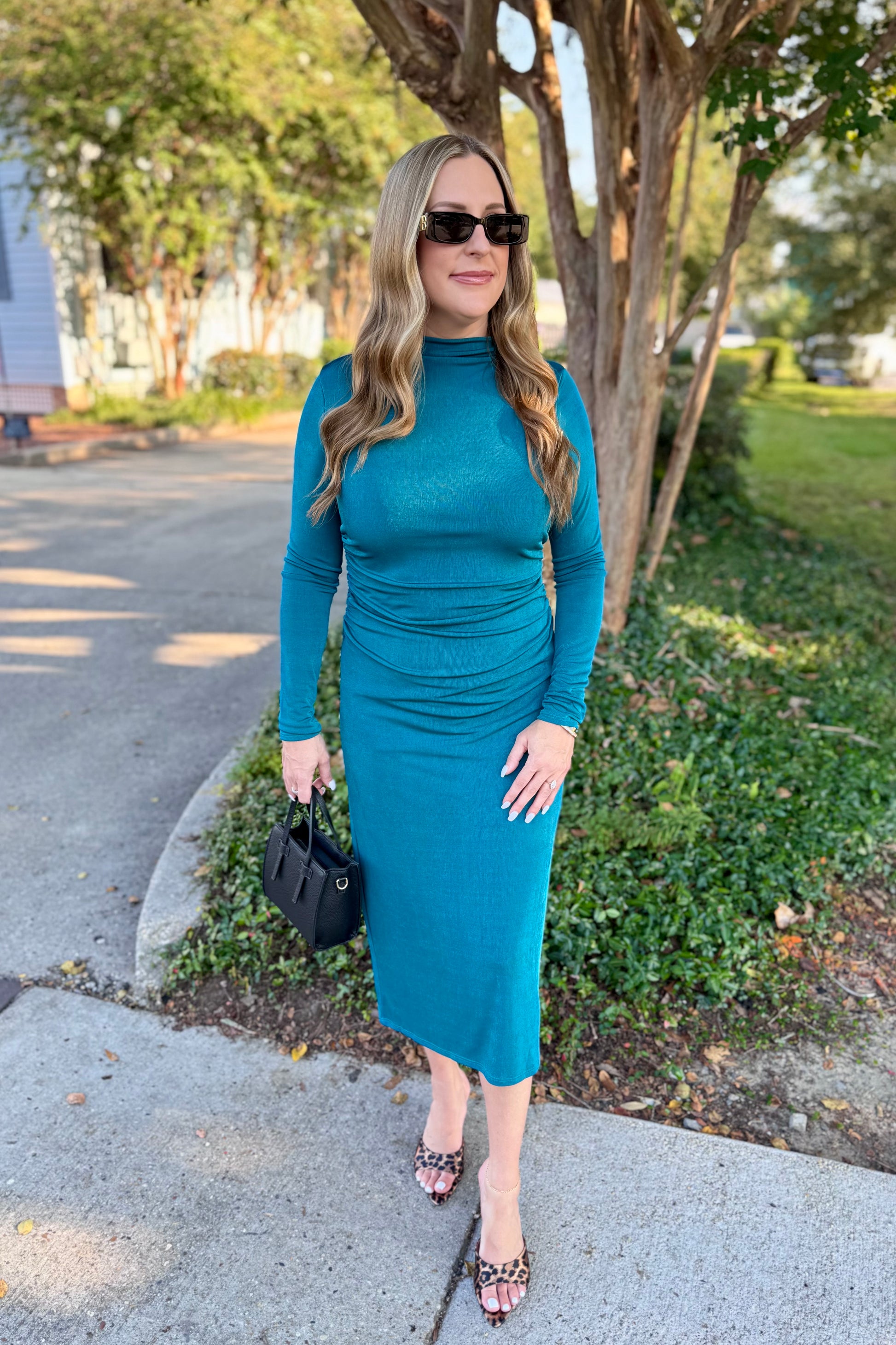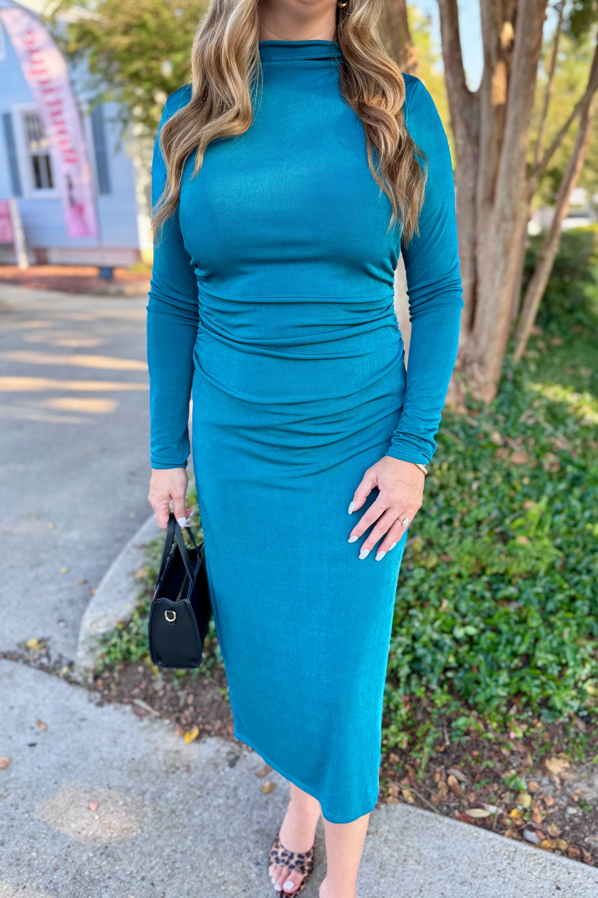 Release your inner fashionista with the Tealen Dress. This gorgeous midi dress features a unique rouche style and stretchy material for a comfortable fit. Its high neck adds a touch of sophistication to any look. Upgrade your wardrobe and turn heads with this must-have dress.